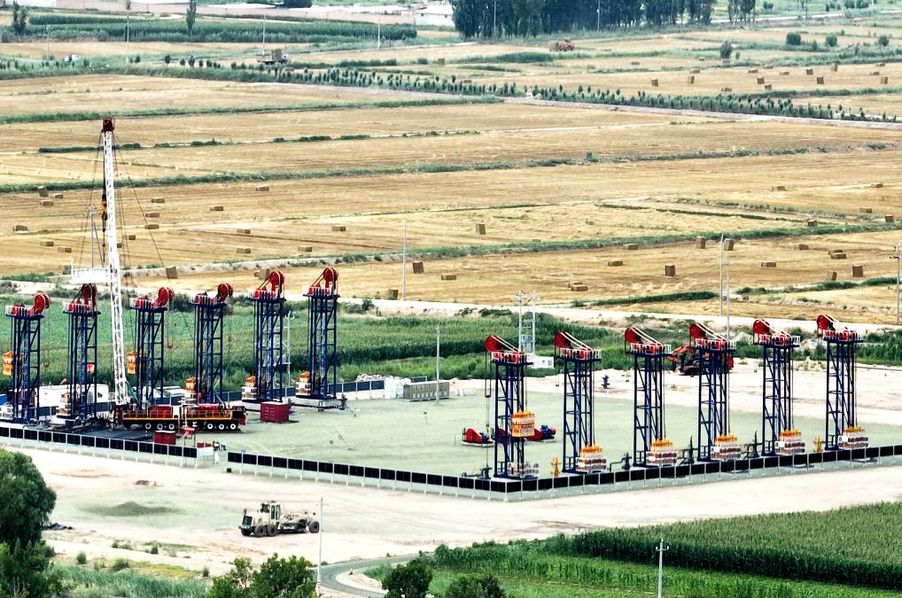 5月31日在内蒙古自治区巴彦淖尔市临河区拍摄的华北油田公司巴彦油田钻井(无人机照片)。新华社记者 李云平 摄
