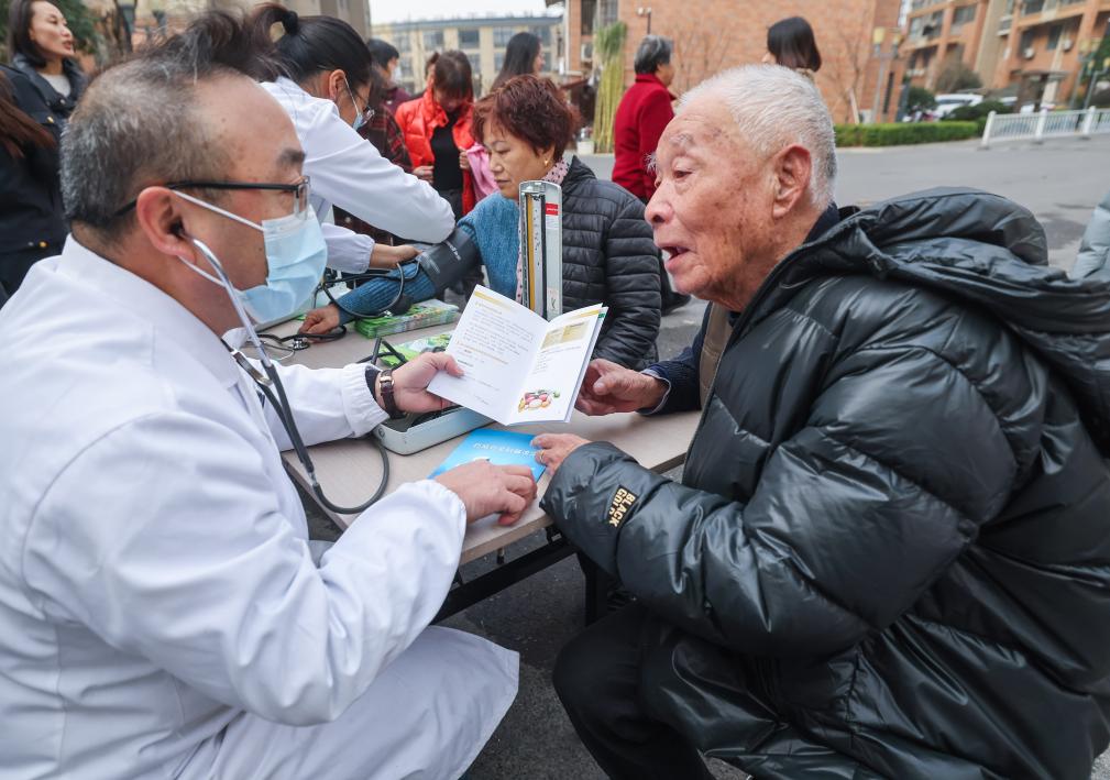 2023年12月13日,在浙江省湖州市吴兴区道场乡浮玉社区内,药店药剂师给居民普及安全用药知识。新华社记者 徐昱 摄